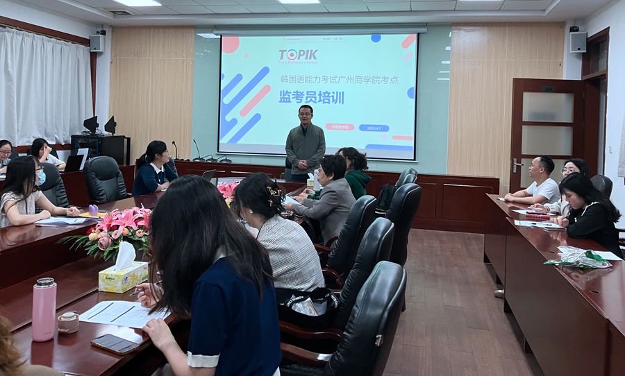 4月7日,我院在第二行政楼308会议室举行了韩国语能力考试监考员培训会,由本次考试考务负责人洪希琳老师主讲。洪希琳从考场分布、考场布置、身份核验、考场纪律、监考流程、材料填写、注意事项等方面进行了详细的讲解,明确了各位监考老师的工作职责与工作要求。为确保考务工作的顺利开展,我院与教务处、保卫处、总务处等部门通力合作,从考试报名、安检器材准备、考场布置,到安全防疫、后勤保障等环节进行了周密的部署,以保证考试的顺利进行。外国语学院副院长袁鑫在监考员培训会作发言,强调本次考试的重要性。