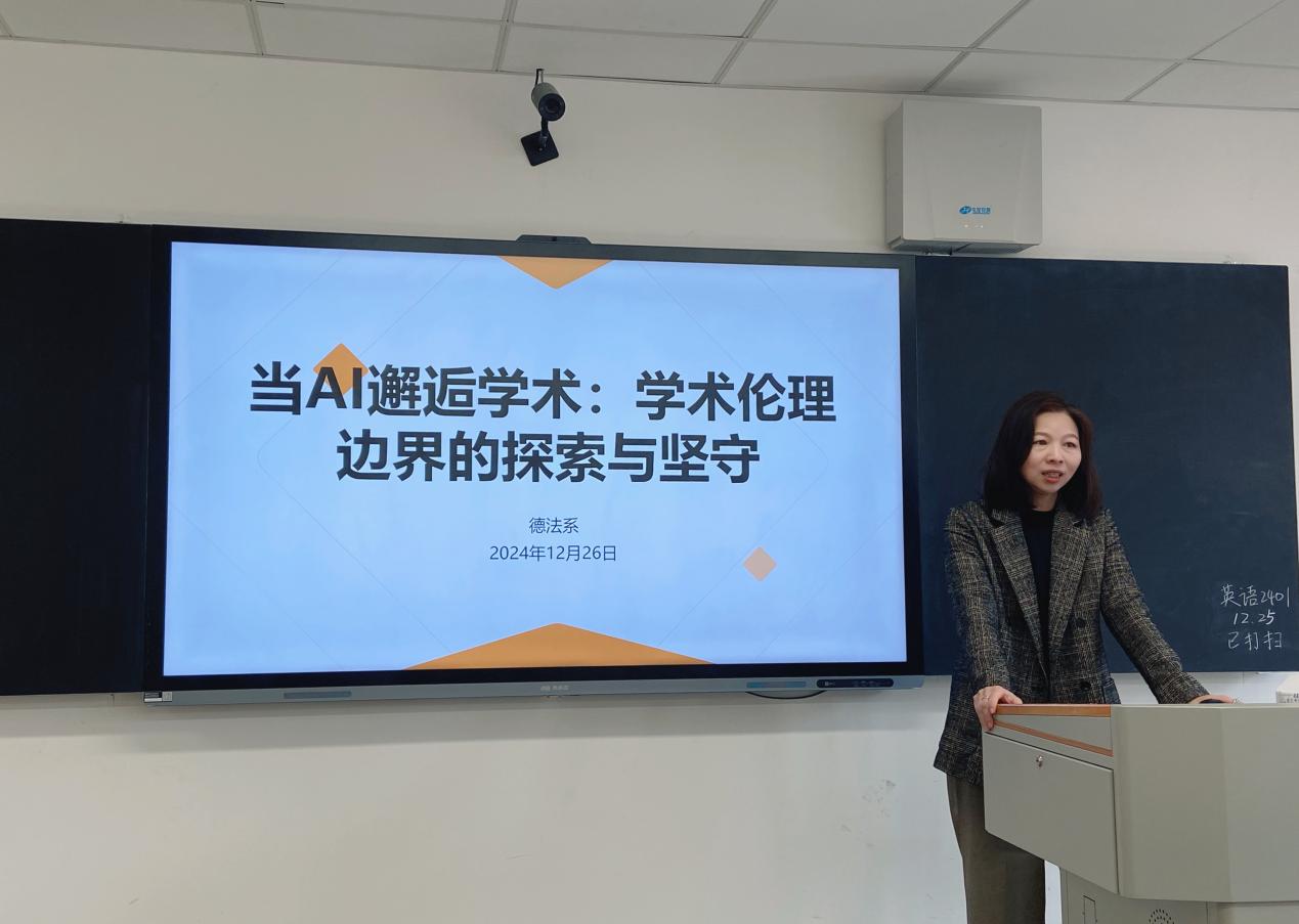 1212日,外国语学院德法系举办了一场以AI邂逅学术:学术伦理边界的探索与坚守为主题的研讨会。本次研讨会由德法系主任周昳旸老师主持,专业负责人潘艳博士和全体教师共同参与,旨在探讨人工智能技术对学生毕业论文的影响及应对策略。